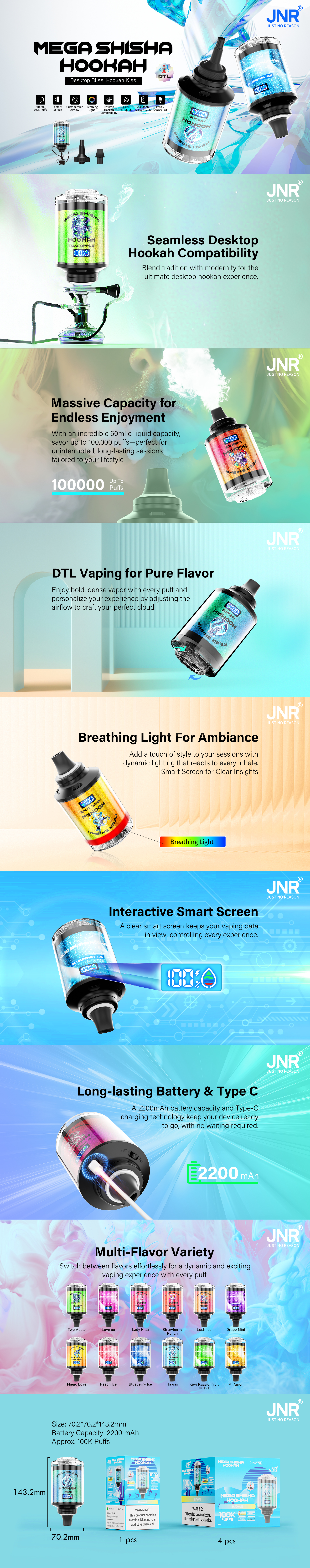 Available in nicotine strengths of 0%, 2%, and 5%, the JNR Mega Shisha Hookah 100K Puffs is ideal for anyone seeking massive clouds, long runtimes, and flavorful variety—anytime, anywhere.